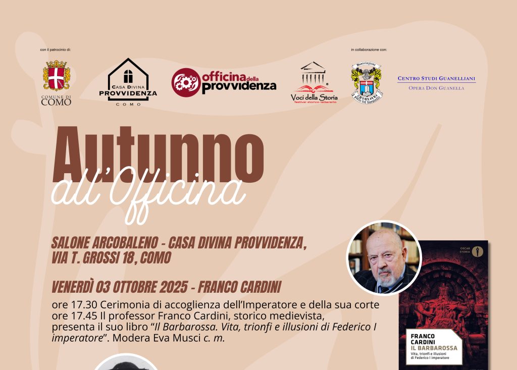 Ed ecco gli eventi di ottobre nell’ambito dell’ “Autunno all’Officina”, che si terranno nel Salone Arcobaleno della Casa Divina Provvidenza (via T. Grossi 18 Como, ampio parcheggio interno), che vedono il patrocinio del Comune di Como e la collaborazione del Festival storico letterario “Voci della Storia”, dell’Associazione Cavalieri Palio del Baradello e del Centro Studi Guanelliani: